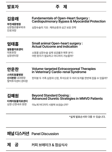 이번 세미나는 심장과 신장 분야에서 활동 중인 국내외 수의학 전문가들이 임상 지식과 치료 경험을 공유하는 자리로 4개의 강의와 1개의 패널 디스커션으로 구성된다.