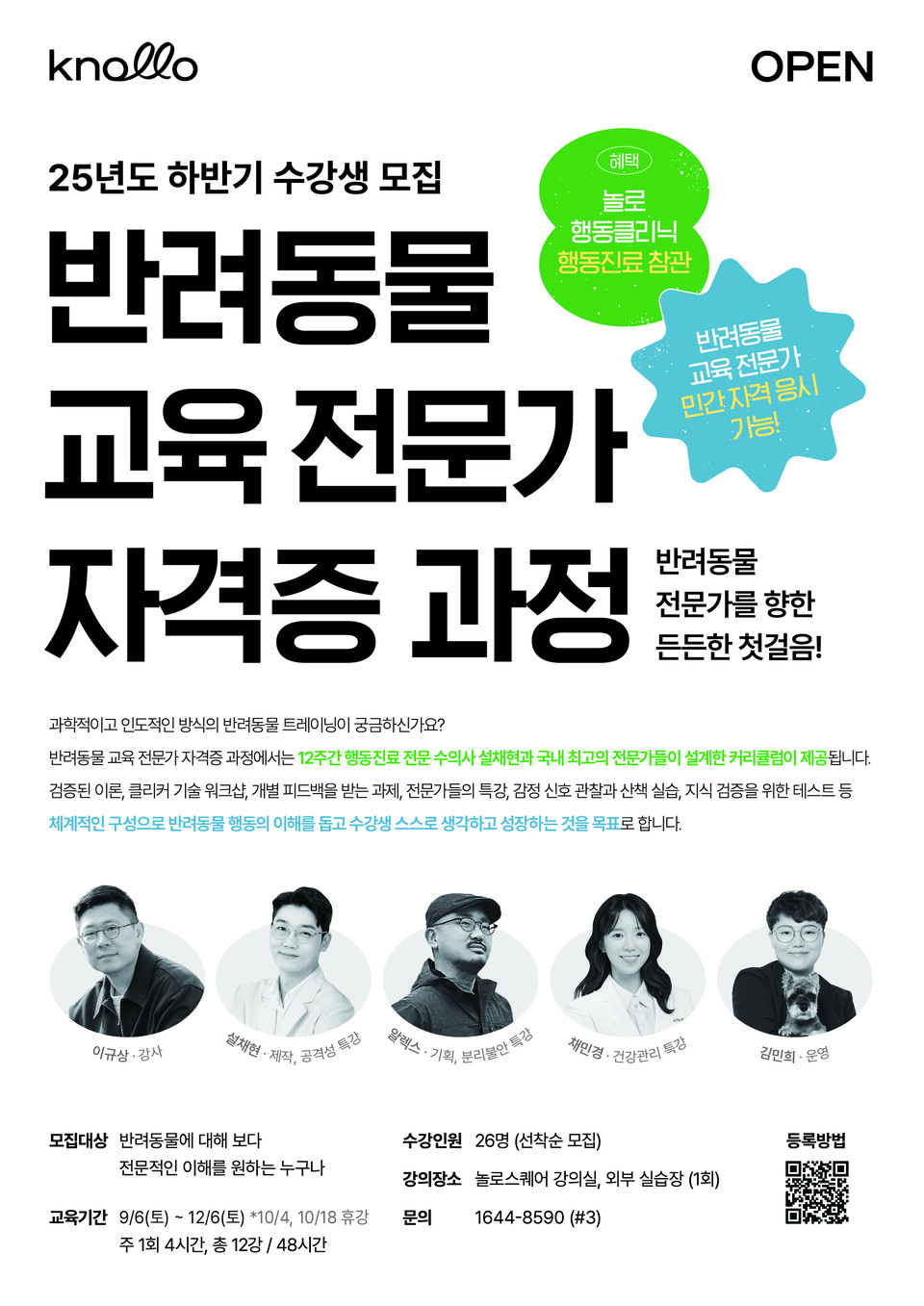 놀로 행동클리닉이 ‘2025년도 하반기 반려동물 교육 전문가 자격 과정’ 수강생을 모집한다.