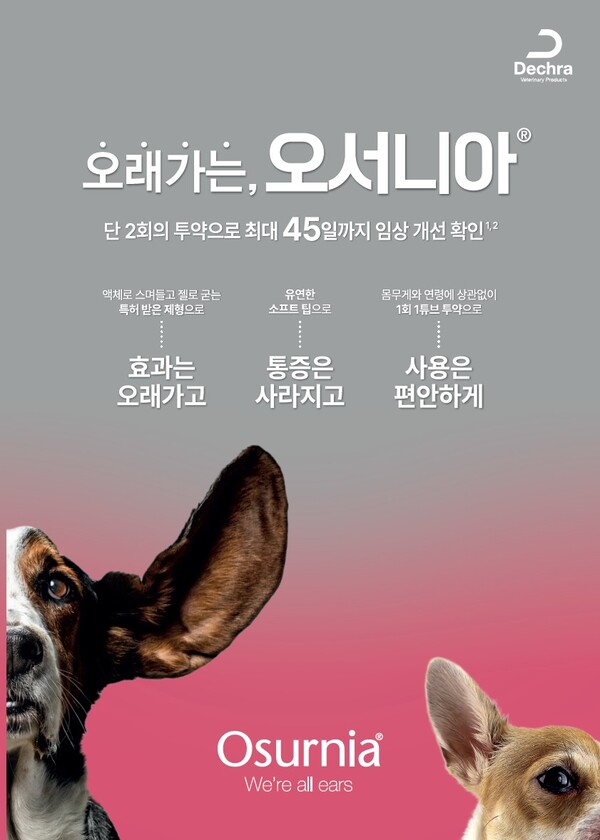 데크라 측은 “‘오서니아’는 외이염 치료의 순응도를 높이는 데 특화된 제품으로 수의사는 첫 투여 후 일주일 뒤 상태를 확인하고, 두 번째 투여를 진행함으로써 환자의 상태를 더 면밀히 관리할 수 있다”며 “단 2회의 투약만으로 보호자와 수의사 모두에게 만족스러운 결과를 제공할 수 있다”고 설명했다.