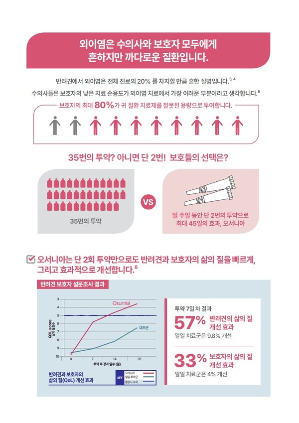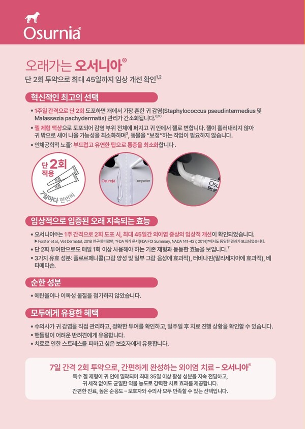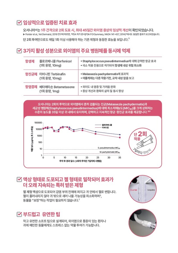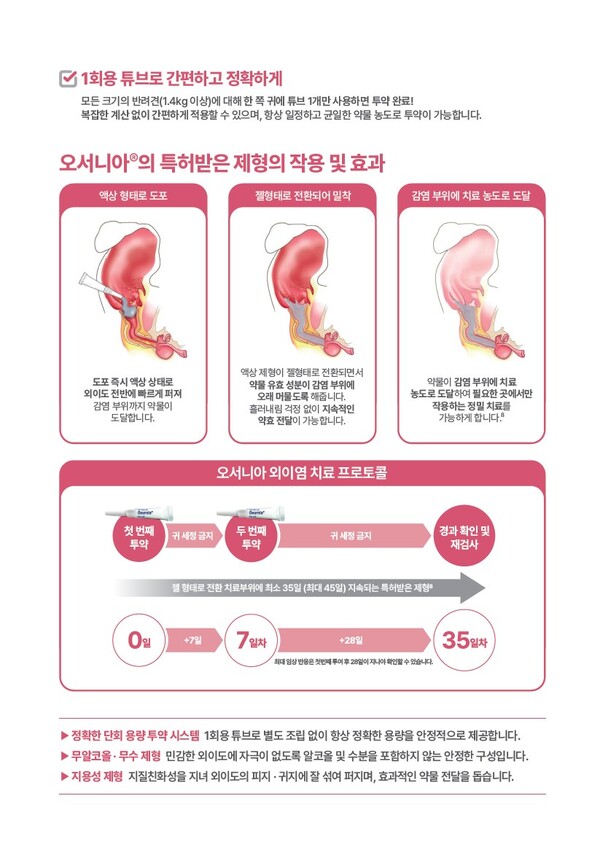 ‘오서니아’는 외이염 치료 과정에서 수의사들이 가장 어려움을 겪는 ‘보호자의 낮은 치료 순응도’를 획기적으로 개선한 제품으로 7일 간격으로 단 2회만 투약하면 최대 45일까지 외이염 치료 효과를 유지할 수 있는 것이 가장 큰 특징이다.