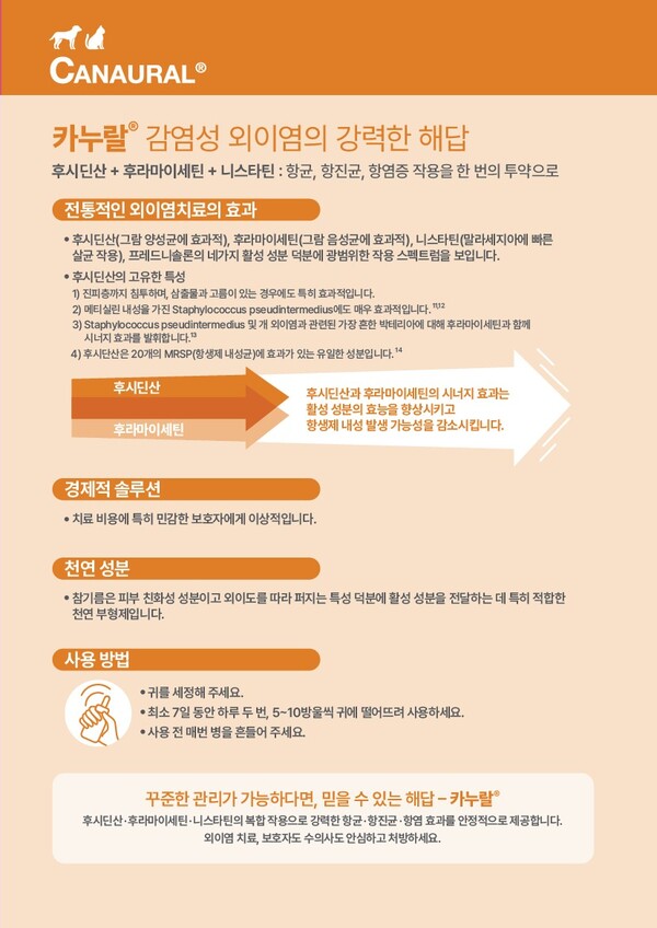 특히 몸무게와 연령에 관계없이 감염된 귀당 1튜브만 사용하면 돼 복잡한 용량 계산 없이 항상 일정한 농도로 투약이 가능하다. 무알코올·무수 제형으로 민감한 외이도에도 자극이 없는 제품이다.