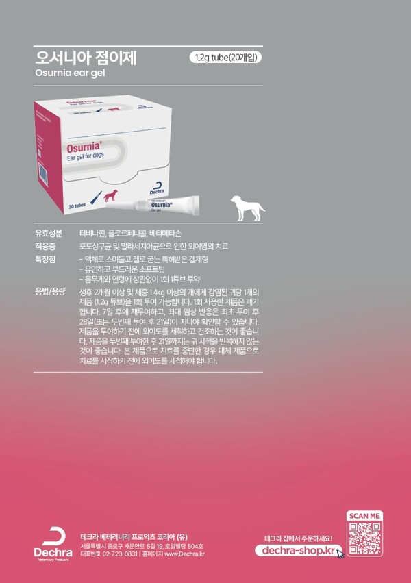 데크라베테리너리프로덕츠코리아(대표 자일스 앤드루 콜리, 이하 데크라)가 반려견 전용 외이염 치료제 ‘오서니아(Osurnia)’를 출시했다.