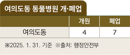 행정안전부 최신 데이터에 따르면, 영등포구 여의도동은 2001년부터 동물병원이 개원하기 시작해 2025년 1월 31일 기준 11개소가 개원, 이 중 7개소(64%)가 문을 닫고, 현재 4개소(36%)가 개원을 유지하고 있다.