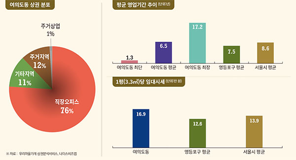 현재 여의도동은 대형 오피스와 초고층 주상복합 아파트가 공존하는 구조로 상권은 점심·퇴근 시간에 집중되며, 주말에는 상대적으로 유동 인구가 감소하는 경향을 보인다.