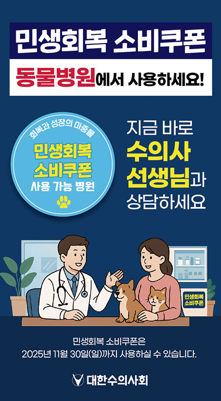 대한수의사회 관계자는 “이번 소비쿠폰을 통해 지역 동물병원 이용이 활성화 되고, 보호자 진료비 부담도 완화될 수 있다”며 “반려동물 복지 향상에 기여할 수 있기를 기대한다”고 밝혔다.