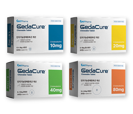 ‘제다큐어’는 사람 알츠하이머 치료제 후보였던 ‘크리스데살라진(Crisdesalazine)’을 병리학적으로 유사한 반려견 인지기능장애에 적용해 탄생한 신약이다. 2021년 2월 출시돼 현재 전국 2,000여 개 동물병원에서 처방되고 있다.