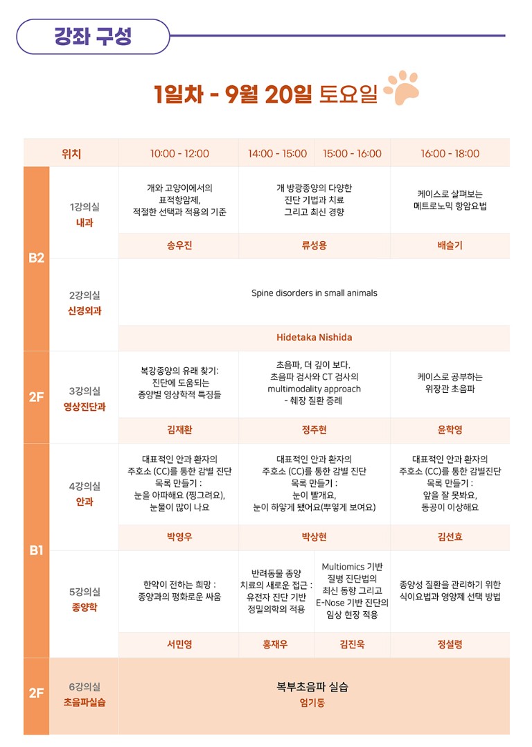 특별히 ‘신경외과’ 강의는 Hidetaka Nishida를 초청해 ‘소동물 척추질환’에 대한 강의를 오전 10시부터 오후 6시까지 원데이로 진행할 계획이다. Hidetaka Nishida는 오사카대학교 수의학박사로 아자부대학교 수의과대학 신경학 및 신경외과 분야 부교수이다.