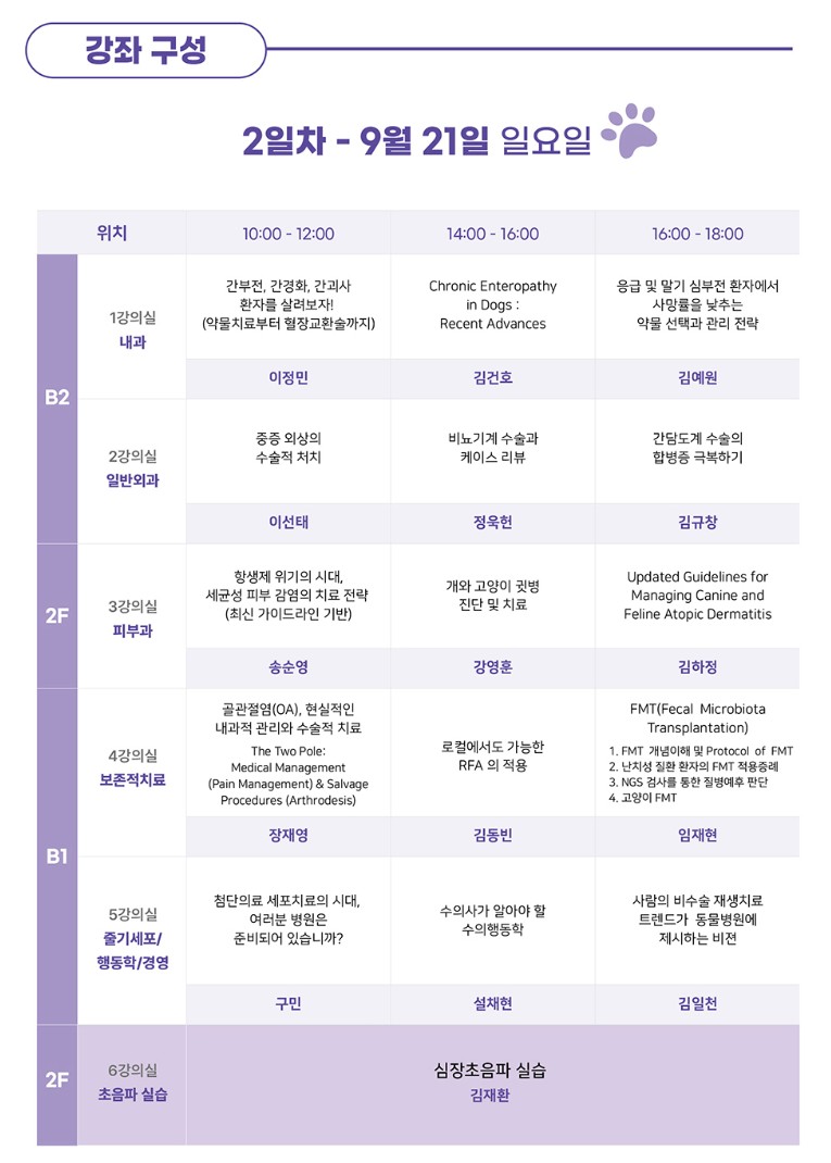 ‘피부과’ 강의는 송순영(청담고운피부과동물병원) 원장이 ‘항생제 위기의 시대, 세균성 피부 감염의 치료 전략’을 최신 가이드라인을 기반으로 제시하고, 강영훈(웨스턴동물의료센터 피부과) 전문의가 ‘개와 고양이 귓병 진단 및 치료’를, 김하정(전남대) 교수가 ‘Updated lGuidelines for Managing Canine and Feline Atopic Dermatitis’를 강의한다.