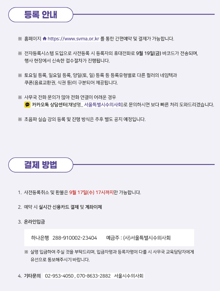 컨퍼런스 등록은 홈페이지(www.svma.or.kr)를 통한 간편예약 및 결제가 가능하며, 전자등록시스템 도입으로 사전등록 시 등록자 휴대전화로 9월 19일(금) 바코드를 전송, 현장에서 신속한 접수절차가 진행된다. 관련 문의는 사무국(02-953-4050) 또는 카카오톡 상담센터(채널명: 서울특별시수의사회)로 하면 된다.