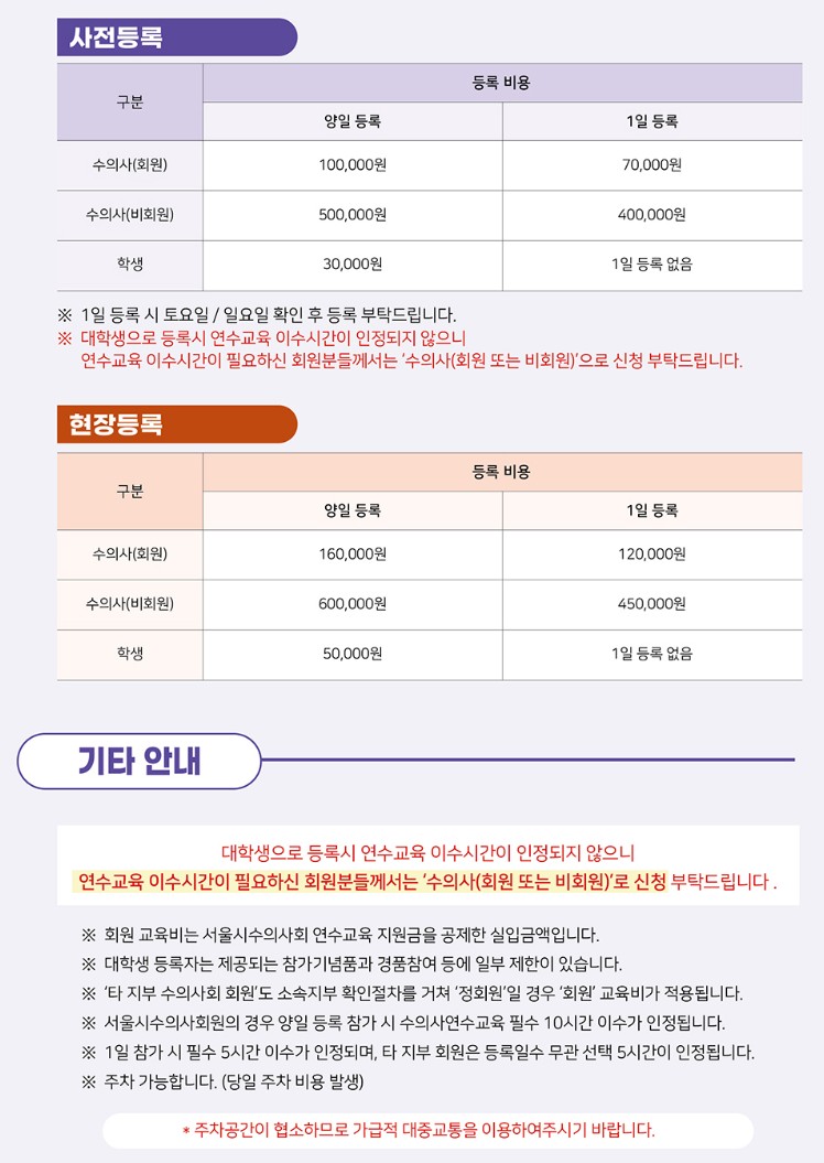 사전등록비는 회원 양일 10만원, 1일 7만원이며, 비회원은 양일 50만원, 1일 40만원이다. 학생은 3만원이다. 양일 등록 참가 시 연수교육 필수 10시간 이수가 인정되며, 1인 참가는 필수 5시간이 인정된다. 타지부 회원은 등록일수 무관 선택 5시간이 인정된다.