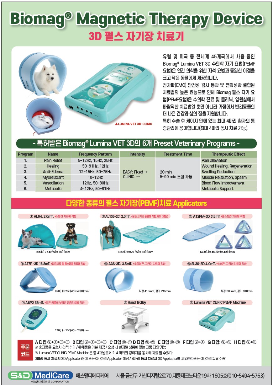 에스앤디메디케어 관계자는 “‘Biomag® Lumina VET 3D’는 안전성과 편의성을 동시에 갖춘 첨단 PEMF 장비로 반려동물의 삶의 질을 높이는 데 큰 도움을 줄 것”이라며 “수의학 진료 및 클리닉, 입원실에서 바람직한 치료법이 될 것”이라고 밝혔다.