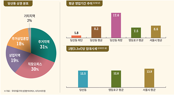 2025년 1분기 기준 당산동의 1평(3.3㎡)당 평균 임대료는 약 12만 5천 원으로 서울시 평균 임대료(13만 9천 원)보다는 다소 낮고, 영등포구 평균(12만 6천 원)과 유사한 수준이다.