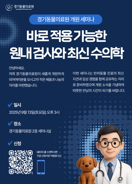 경기동물의료원(대표원장 윤국진·김범수·김태정·이승혁)이 새롭게 병원명을 바꾸고, 확장 개원을 기념해 오는 9월 13일(토) 오후 3시, 2층 세미나실에서 ‘바로 적용 가능한 원내 검사와 최신 수의학’을 주제로 개원 세미나를 개최한다.