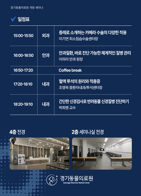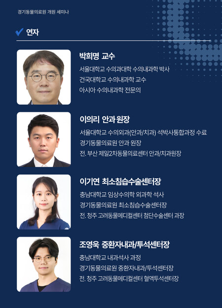 이번 행사에는 경기동물의료원 자문인 박희명(건국대) 교수를 비롯해 이의리(안과) 원장, 이기연(최소침습수술센터) 센터장, 조영욱(중환자내과/투석센터) 센터장 등 특화센터장들이 연자로 총 출동한다.