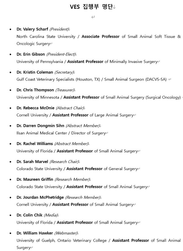 신동민 센터장은 또한 VES 집행부 위원으로 공식 위촉됐다. VES 집행부는 미국과 유럽 수의과대학 외과 교수진 중심의 흉복강경 전문가 그룹으로 구성돼 있으며, 아시아 지역에서 위촉된 사례는 이번이 처음이다.