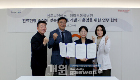 해마루동물병원(이사장 김소현)과 수의 IT 전문기업 ㈜인투씨엔에스(대표 허성호)는 최근 전략적 업무협약을 체결하고, 하이브리드 기반 전자차트 시스템 ‘인투벳(intoVET GE)’의 고도화를 위한 공동 프로젝트를 본격 추진하기로 했다.