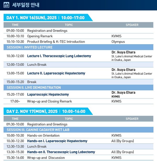 16일에는 흉강경 폐엽절제술과 복강경 간절제술 술기에 대한 강의를 시작으로, 오후에는 Ehara 수의사의 실제 수술 시연이 진행된다. 모든 강의에는 동시통역이 제공될 예정이다.