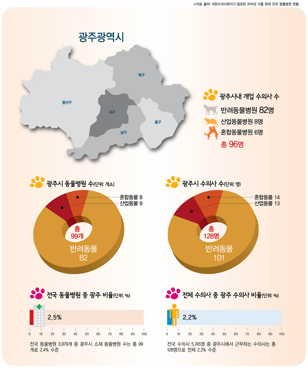 광주 동물병원 99개·수의사 128명전국 동물병원 중 2.4% … 전체 수의사 중 2.2% 해당 저작권자 © 데일리개원 무단전재 및 재배포 금지 개원 다른기사 보기 페이스북 트위터 URL복사 네이버라인 기사공유하기