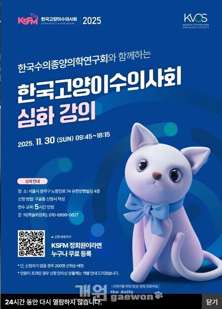 이번 심화 강의는 국내 고양이 진료의 전문 영역 확대를 목표로 기획돼 흉강종양과 유선종양, 전종격동 질환 등 고양이에서 빈번하게 발생하는 주요 질환을 주제별로 다뤄 임상 수의사들에게 실질적인 진단 및 치료 지침을 제공할 예정이다.