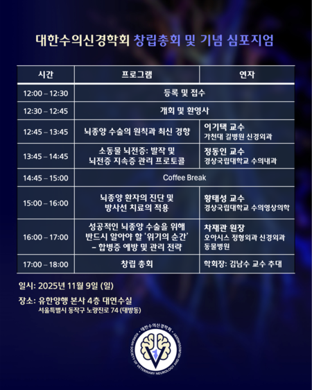 이번 행사는 국내 수의신경외과 분야의 공식 학회 출범을 기념하며 인의 뇌종양 수술 권위자인 이기택(가천대) 교수를 비롯한 신경 분야 전문가들의 강연이 준비됐다.