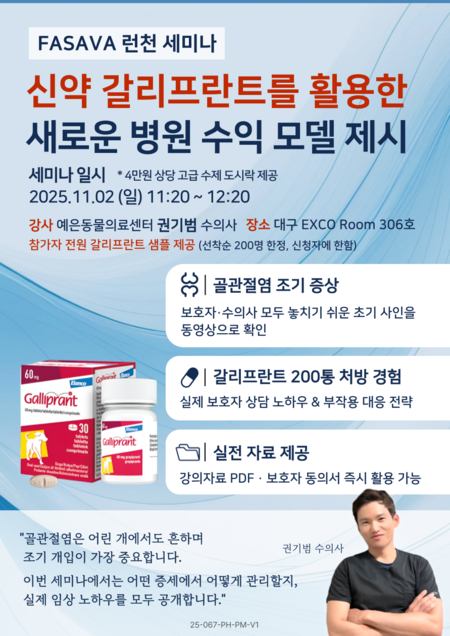 신약 ‘갈리프란트(Galliprant)’를 활용한 새로운 병원 수익 모델을 제시할 이번 런천 세미나에서 권기범 원장은 보호자와 수의사 모두 놓치기 쉬운 초기 사인을 동영상으로 확인하며 골관절염 조기 증상에 대해 다루고, ‘갈리프란트’ 200통 처방 경험을 바탕으로 한 실제 보호자 상담 노하우와 부작용 대응 전략을 제시할 예정이다.
