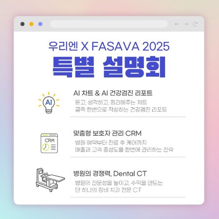 우리엔 관계자는 “이번 ‘FASAVA 2025’에서 “듣고, 생각하고, 정리하는 차트”라는 슬로건으로 우리엔 AI를 선보인다”며 “진료실로 들어온 AI가 만들어 내는 ‘자동화’의 마술을 직접 체험해 보실 수 있도록 체험 신청을 받는다”고 밝혔다.