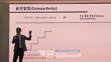 대구 EXCO 306호에서 오전 11시 20분부터 진행된 세미나에서 권기범 원장은 “OA는 단순한 구조적 손상이 아닌 삶의 질과 연관된 전신적 통증 질환으로 이해해야 한다”며 “OA는 조기진단이 매우 중요하다. 따라서 조기 개입을 통한 진행 억제 전략을 세우고, 체중·운동·보조요법을 포함한 통합적 OA 관리 플랜을 수립해야 한다”고 강조했다.