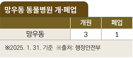 행정안전부 최신 데이터에 따르면, 중랑구 망우동은 2003년부터 동물병원이 개원하기 시작해 2025년 1월 31일 기준 총 4개소가 개원, 이 중 1개소(25%)가 문을 닫고, 3개소(75%)가 현재까지 영업을 유지하고 있다.