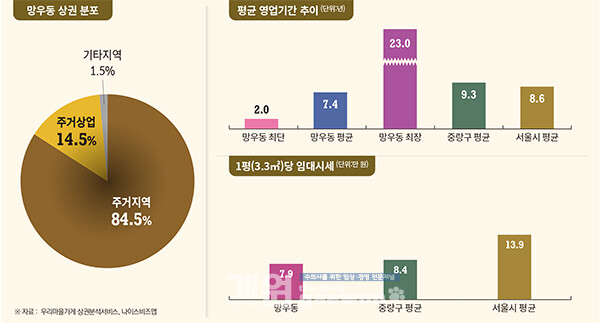 망우동은 주거지역 84.5%, 주거상업지역 14.5%, 기타지역 1.5%로 구성된 전형적인 주거 중심 상권이다.