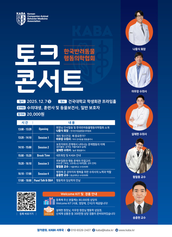 한국반려동물행동의학회(회장 나응식, 이하 KABA)가 반려동물의 행동 문제에 대한 심도 있는 논의와 해결책을 모색하는 ‘토크 콘서트’를 오는 12월 7일(일) 건국대학교 학생회관 프라임홀에서 개최한다.