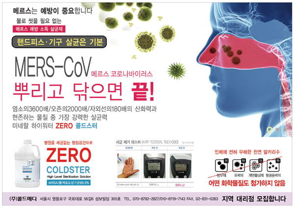 콜드메디 측은 “최근 심각한 문제가 되고 있는 메르스뿐만 아니라 병원의 특성상 각종 바이러스와 세균들로 쉽게 오염될 수 있는 만큼 살균 소독이 더욱 중요하다”며 “‘Zero Coldster’는 뿌리고 닦아만 주면 되는 간편한 사용으로 살균 소독이 가능하고, 화학물질이 전혀 첨가되지 않아 인체에 무해한 만큼 활용도가 더욱 높다”고 강조했다.