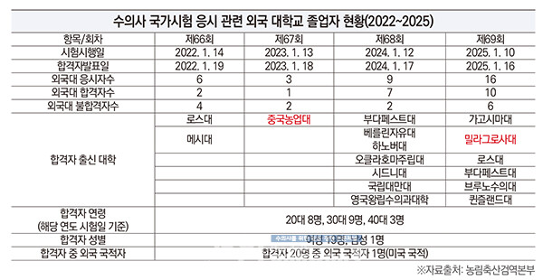 특히 중국농업대(67회)와 밀라그로사대(69회) 출신 응시자의 경우 현행 인정 기준이 아닌 과거의 ‘수의사법 경과규정(법률 제5953호 부칙 제4항)’을 적용받아 응시 자격을 얻은 것으로 나타났다. 이는 현재 엄격해진 수의학 교육 기준과는 동떨어진 처사라는 것이 수미연 측의 설명이다.
