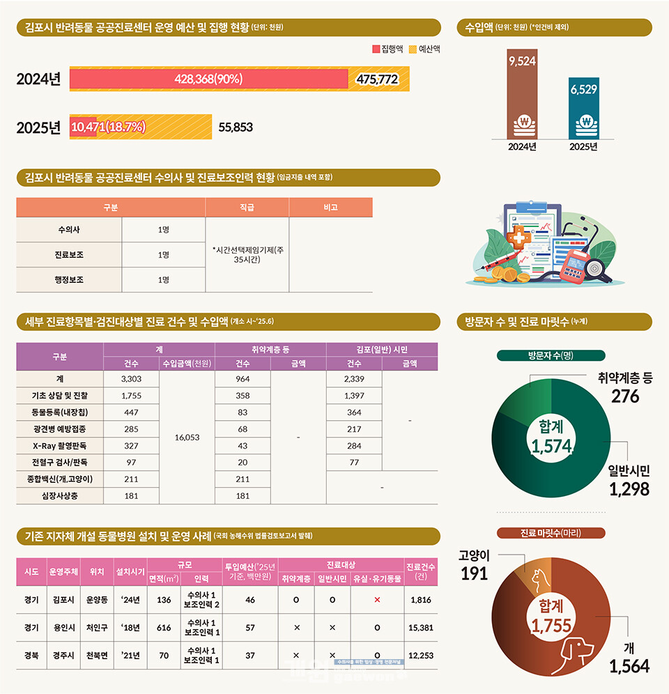 대한수의사회가 지난 9월 기자간담회에서 발표한 자료에 따르면, 김포시 반려동물 공공진료센터는 2024년도 예산액 465,772천 원에서 90%에 달하는 428,368천 원을 집행했으나 올해 예산액은 지난해 12%에도 못미치는 55,853천 원으로 이 중에서도 19%가 안되는 10,471천 원을 집행액으로 사용했다.
