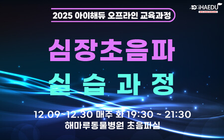 아이해듀 오프라인 교육과정 ‘심장초음파 실습 과정’이 오는 12월 9일부터 12월 30일까지 매주 화요일 저녁 7시 30분부터 9시 30분까지 총 4회에 걸쳐 해마루동물병원에서 진행된다.