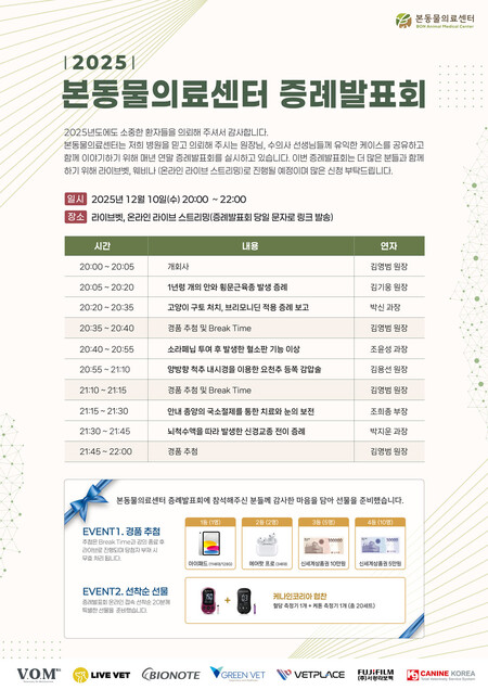 본동물의료센터는 매년 연말 수의사 대상 증례발표회를 열어왔으며, 올해는 라이브벳 웨비나 방식으로 전환해 더 많은 수의사들이 참여할 수 있도록 했다.