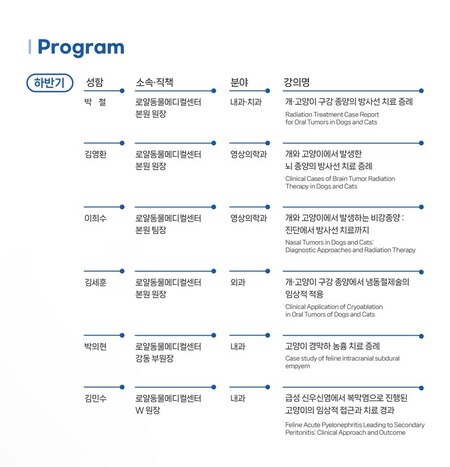 이번 하반기 증례발표회에는 로얄동물메디컬센터 본원 박철, 김영환, 이희수, 김세훈 원장과 박의현(로얄동물메디컬센터 강동) 부원장, 김민수(로얄동물메디컬센터 W)원장이 연자로 참여해 다양한 임상 케이스를 공유한다.