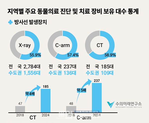 수의미래연구소(이하 수미연)가 지난 11월 26일 발표한 영상장비 보유 현황 분석 결과에 따르면, 최근 6년(2018~2024)간 국내 동물병원 영상장비는 빠르게 증가했으나 장비의 절반 이상이 여전히 수도권에 편중된 것으로 나타났다.