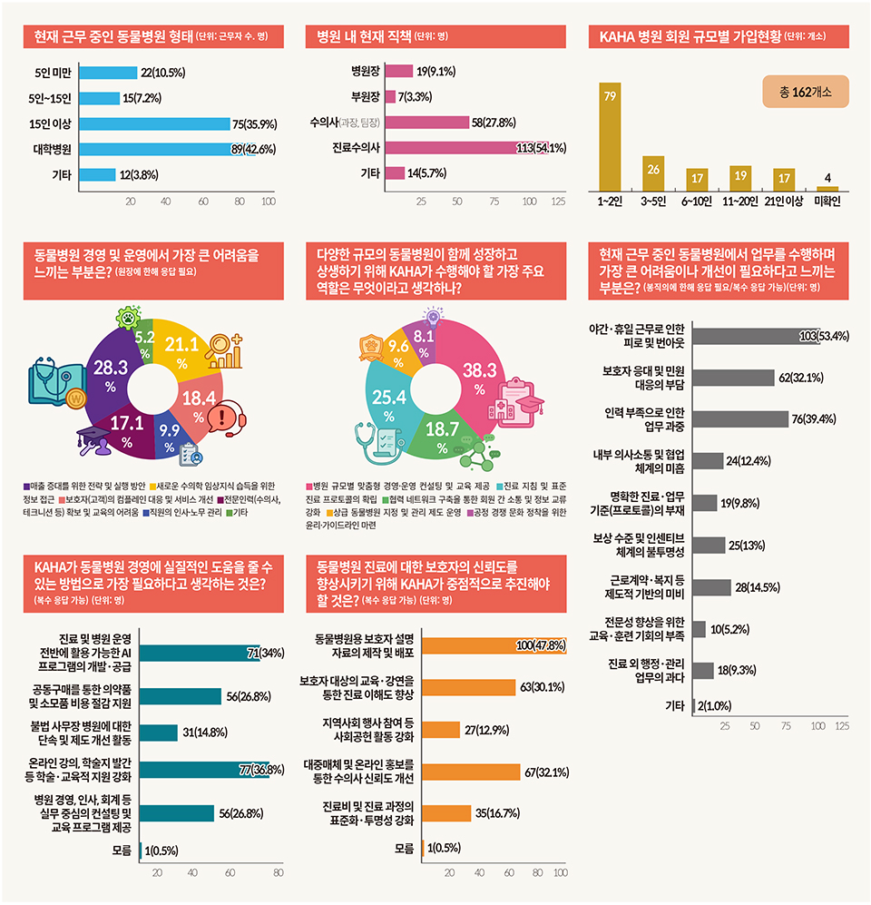 설문조사에서는 병원 경영에서 가장 큰 어려움으로 ‘매출 증대를 위한 전략 및 실행 방안’이 28.3%로 가장 많았으며, ‘새로운 수의학 임상지식 습득을 위한 정보 접근’(21.1%), ‘보호자 컴플레인 대응 및 서비스 개선’(18.4%)이 뒤를 이었다.