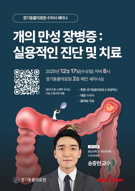 경기동물의료원 관계자는 “바쁜 일정 속에서도 진료와 학문 발전을 위해 끊임없이 노력하는 임상수의사들에게 깊은 존경과 감사를 전한다”면서 “이번 세미나가 만성 장병증과 관련해 임상 현장에 실질적으로 도움이 되는 실용적인 지식과 통찰을 제공하는 시간으로써 진료 역량을 강화하는 의미 있는 기회가 되기를 바란다”며 많은 참여를 당부했다.
