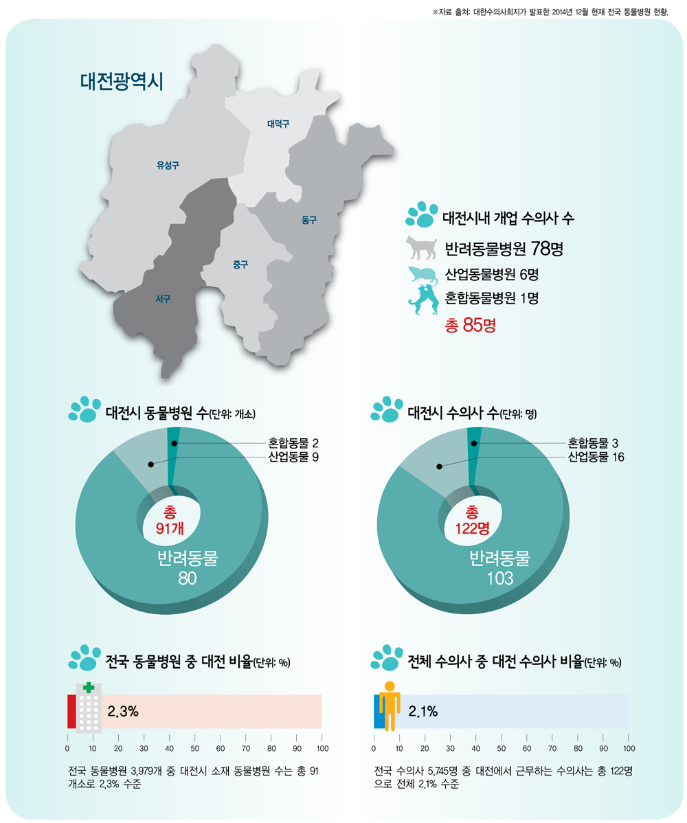 대전시 동물병원 91개·수의사 122명 전국 동물병원 중 2.3% 수준 … 전체 수의사 중 2.1% 해당 저작권자 © 데일리개원 무단전재 및 재배포 금지 개원 다른기사 보기 페이스북 트위터 URL복사 네이버라인 기사공유하기