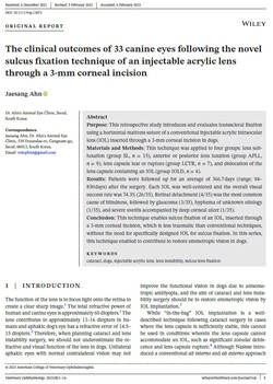 기존에 해외에서 소개된 인공렌즈봉합술은 8mm 각막절개가 필요하고, 봉합용 특수 인공렌즈가 필요하다. 이에 안재상 원장은 특수 인공렌즈 없이 백내장 수술 시 흔히 쓰는 인공렌즈를 이용해 3mm 절개만으로 인공렌즈를 봉합할 수 있는 수술법을 개발해 세계적인 수의안과학 저널인 「veterinary ophthalmology」 논문에 게재했고, 올해 5월에 열린 유럽수의안과학회(ECVO)에서 Dr. Marta Leiva(바르셀로나대학) 교수의 강연 때 혁신적인 인공렌즈 봉합술로 소개됐다.