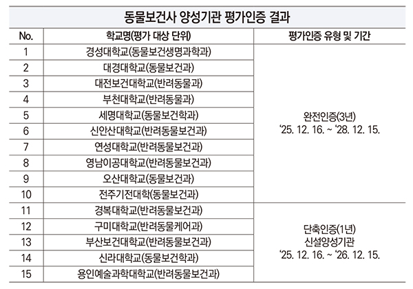 농림축산식품부(이하 농식품부)가 12월 16일 동물보건사 양성기관 평가인증 결과를 발표, 총 15개 대학교가 인증을 통과했다. 완전인증(3년)은 10개 대학, 단축인증(1년)은 5개 대학이다.