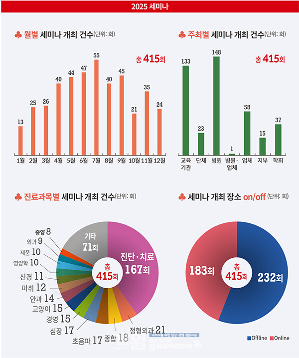 본지가 집계한 2025년 세미나는 총 415회로 학회와 교육기관, 동물병원, 업체 등 다양한 주체를 중심으로 꾸준히 개최됐다.