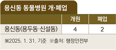 행정안전부 최신 데이터에 따르면, 동대문구 용신동(용두동·신설동)은 1990년부터 동물병원이 개원하기 시작해 2025년 1월 31일 기준 총 7개소가 개원, 이 중 2개소(28.6%)가 문을 닫고, 현재 5개소(71.4%)가 개원을 유지하고 있다.