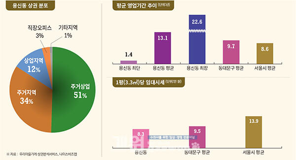 용신동은 주거상업 지역이 51%로 가장 높은 비중을 차지하며, 주거지역 34%, 상업지역 12%, 직장·오피스 3%, 기타 1%로 구성된 혼합형 생활권이다. 청량리·제기동과 인접해 생활 인프라 이용객의 유입이 꾸준하며, 역세권 배후지 특성상 주중과 주말 모두 안정적인 수요가 형성된다.