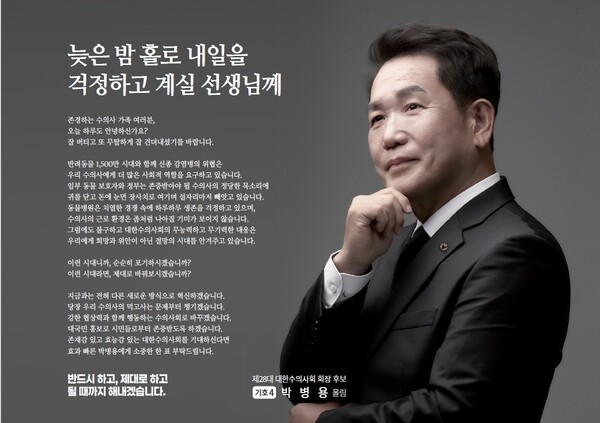 대국민 홍보로 시민들로부터 존중받도록 하겠다. 반드시 하고, 제대로 하고, 될 때까지 하는 회장이 되겠다. 말이 아닌 행동으로 회원들이 체감할 수 있는 변화를 만들 것이다. ‘동물보다 수의사가 먼저’라는 원칙을 행동으로 증명할 준비가 돼 있다. 그 역할을 박병용이 하겠다.