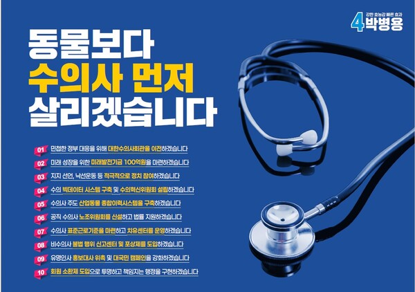 공직 수의사를 위한 노조위원회 신설과 법률 지원 체계를 구축하고, 비수의 불법 진료를 근절할 수 있는 시스템도 도입하겠다.