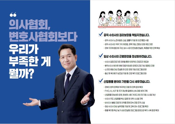 집회와 선언, 정책 연대 등 수의사회 정치 참여를 강화하고, 수의 빅데이터 시스템과 ‘수의정책위원회’를 설립해 정책 주도력을 높이겠다.