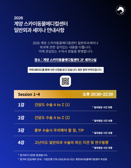 계양 스카이동물메디컬센터가 주최하는 새해 첫 번째 ‘2026년 계양 스카이동물메디컬센터 본원 세미나’가 ‘간담도 수술부터 고난이도 수술적 치료법’을 주제로 1월 20일부터 2월 10일까지 매주 화요일 총 4강으로 진행한다.