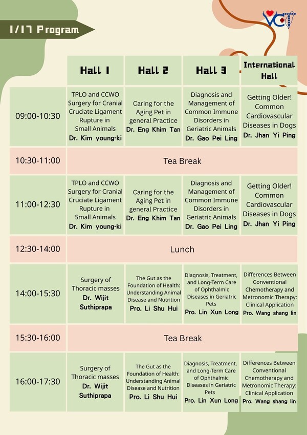 대만을 비롯한 해외에서 16명의 전문가와 교수, 박사가 연자로 참여해 심도 있는 내용을 다룰 예정이다. 강의는 △흉·복강 연부조직 종양 외과 △골·관절 및 인대 손상에 대한 정형외과 수술 △뇌·신경 CT 및 MRI 영상 판독 △노령 심장질환의 내과적 최신 치료 △안과 질환의 최적 치료 전략 △신경학, 피부과, 노령성 신장질환 △종양학, 중수의학, 영양학 및 노령 동물 케어를 연제로 최근 임상수의사들에게 가장 필요한 주요 임상 분야의 최신 지견을 아우르는 고품질 종합 학술 포럼이 될 전망이다.